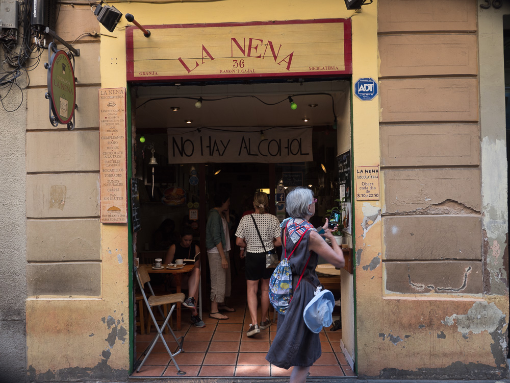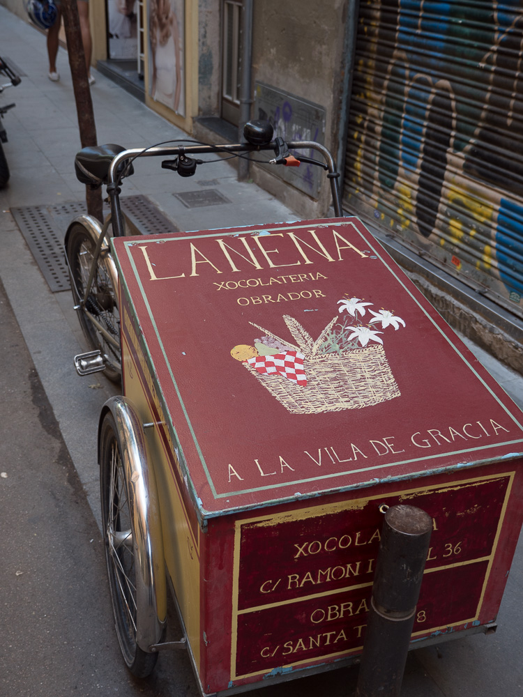 We learned that Barcelona residents eat about 5 meals/day (good idea) and sleep about one hour less than most people (not-so-good idea). We followed the five meal precept, launching our culinary Gracia neighborhood adventure at La Nena, where we drank thick hot chocolate topped with whipped cream. Heaven.