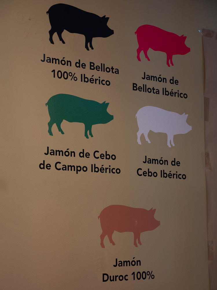 On to one of Spain’s most well-known products, ham. We learned about five kinds of pigs raised for ham, from those kept in pens and fed industrial food to Iberico hogs ranging free on oak tree plantations to munch on acorns all day long. The last produce ham with a most complex and satisfying taste.