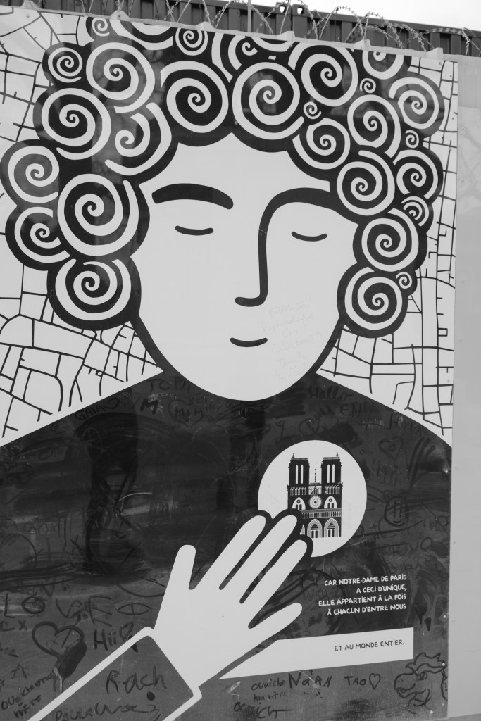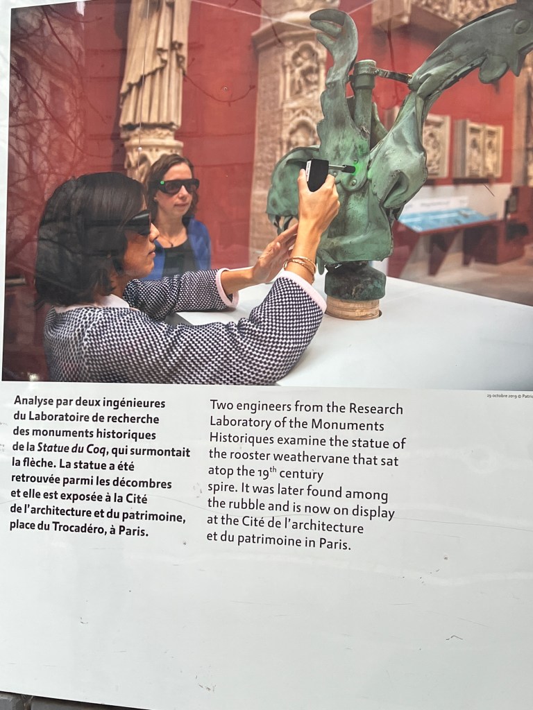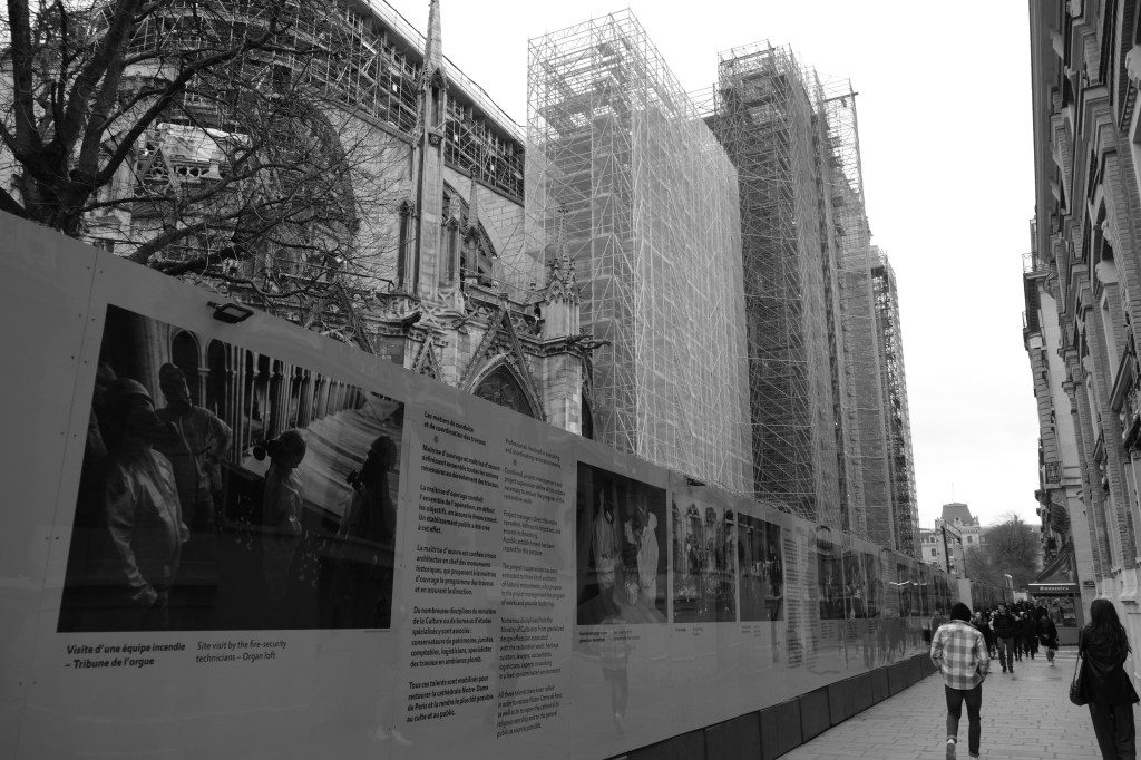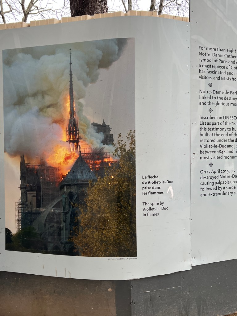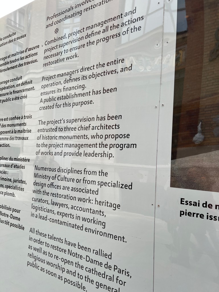Hundreds of workers with all kinds of special skills are employed in the recovery effort, and that story is told on the construction barrier surrounding the church. On one side, there are images accompanied by text filled with description and statistics. For example, there more than 40 companies with workers offering different skills have been working on the site. One set of skills is provided by the “rope access technicians,” who work in teams, suspended by ropes, to build scaffolding, clean, remove or replace parts of burned material, and undertake any necessary other work on the roof, steeples, and spires.