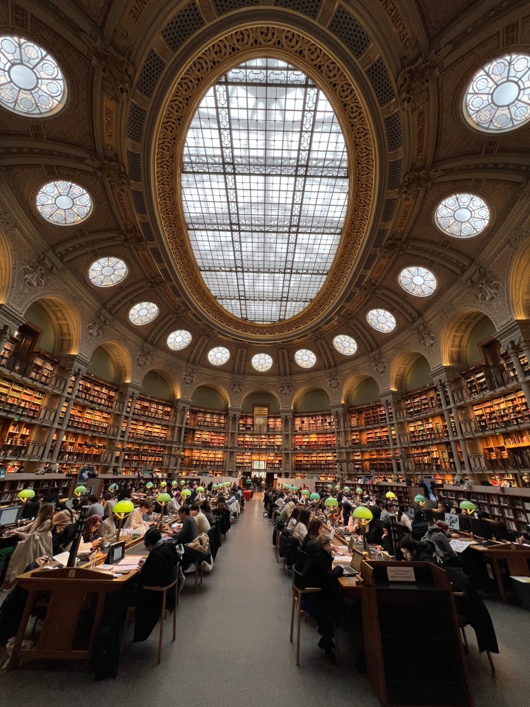 After the photography exhibits, we walked to the Bibliothèque nationale de France, Richelieu site, and walked in to the Oval Room, a beautifully restored public reading room, where rows of desks were occupied by what I assumed to be students doing research (most with laptops). Thousands of books line the walls along the periphery of the room. By sheer coincidence, as I was photographing some of those books, I noticed a fat volume, “Dictionnaire généalogique des familles du Québec.” In it, I found an entry for Simon Savard, an ancestor on the Savard side of the family who was the one who migrated to Quebec and made it possible for me to be writing these lines.