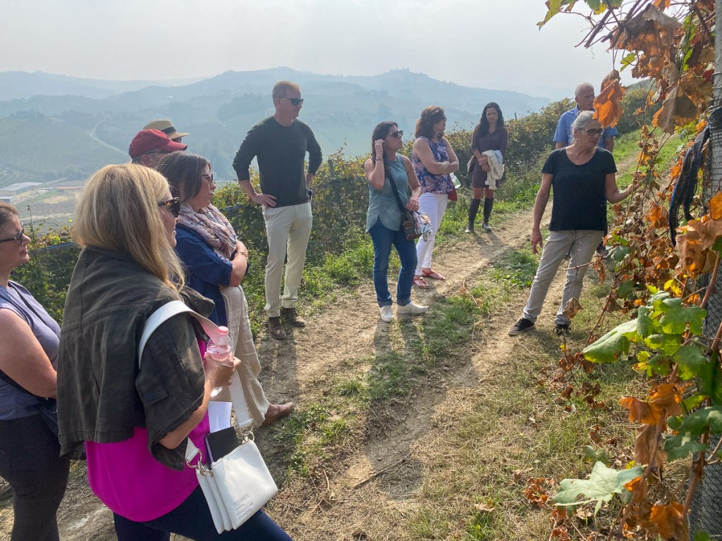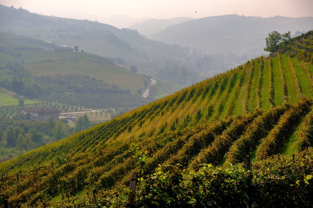Our first winery today was the Produttori del Barbaresco, a coop winery with about 55 member farmers. Our guide brought us to a spot overlooking the Tanaro River valley and the hills beyond. Pointing to the distance, he told us that, on a clear day, we could see the Alps bordering Italy and France. It was not a clear day. The fog — more like a haze — was a constant companion on our tour, and today was no exception. The moisture comes from the soil, we were told, and condenses in fog that stays put in still air protected from prevailing winds by the Alps.