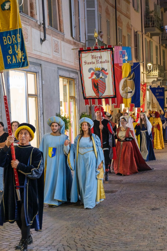 After our tour of the Punset Winery, we were brought back to Alba, and had some time to ourselves before we were to meet for a farewell apericena in the town center. I wandered the streets for an hour or so. The city was preparing for the International Alba White Truffle Festival, which in 2023 ran from October 7 — the day we left — until December 3. The festival has been going on since 1929, when Giacomo Morra had the idea of tacking on a truffle section to the extant end-of-harvest celebrations. Over the years, the festival has grown, with a variety of activities, food, wine, and the Truffle World Market, where truffle hunters bring in their finds, and sell them for a lot of money. As I’ve mentioned before, these delicacies are expensive. In Stanley Tucci’s “Searching for Italy” episode on Piedmont, he talks of a two pound truffle being sold at auction in 2019 for 100,000 Euros (about $109,000 today). That is about $3,400 per ounce. By contrast, gold is selling for a little over $2,000 per ounce today. Although the fair was starting the day we left, parades and festivities started the evening of our apericena.
