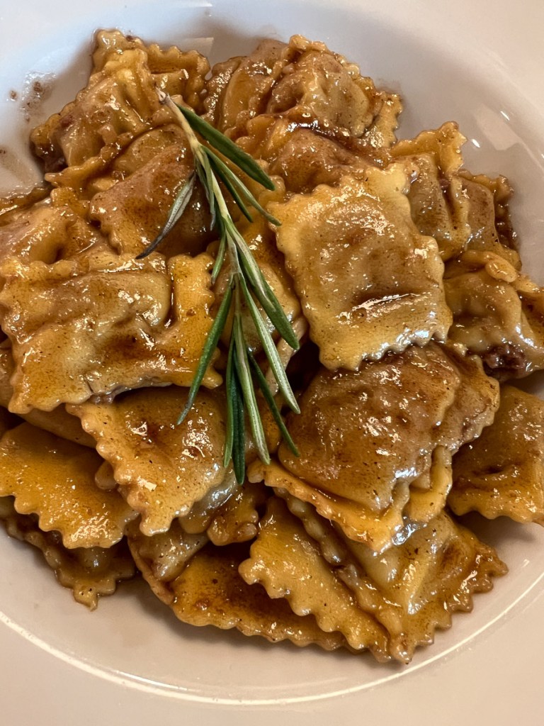 After a couple of hours roaming the town, it was time for lunch at Pastificio Defilippis, where we each tried typical Piedmontese dishes: Agnolotti Classici de Carne al Hugo D’Arrosto (like a mini ravioli with meat and gravy), and Plin Di Carne E Verdure Al Burro Fuso (another little stuffed pasta with meat and vegetables, butter and sage). Delicious. Oh, and there must have been wine with that, but I didn’t write down what.