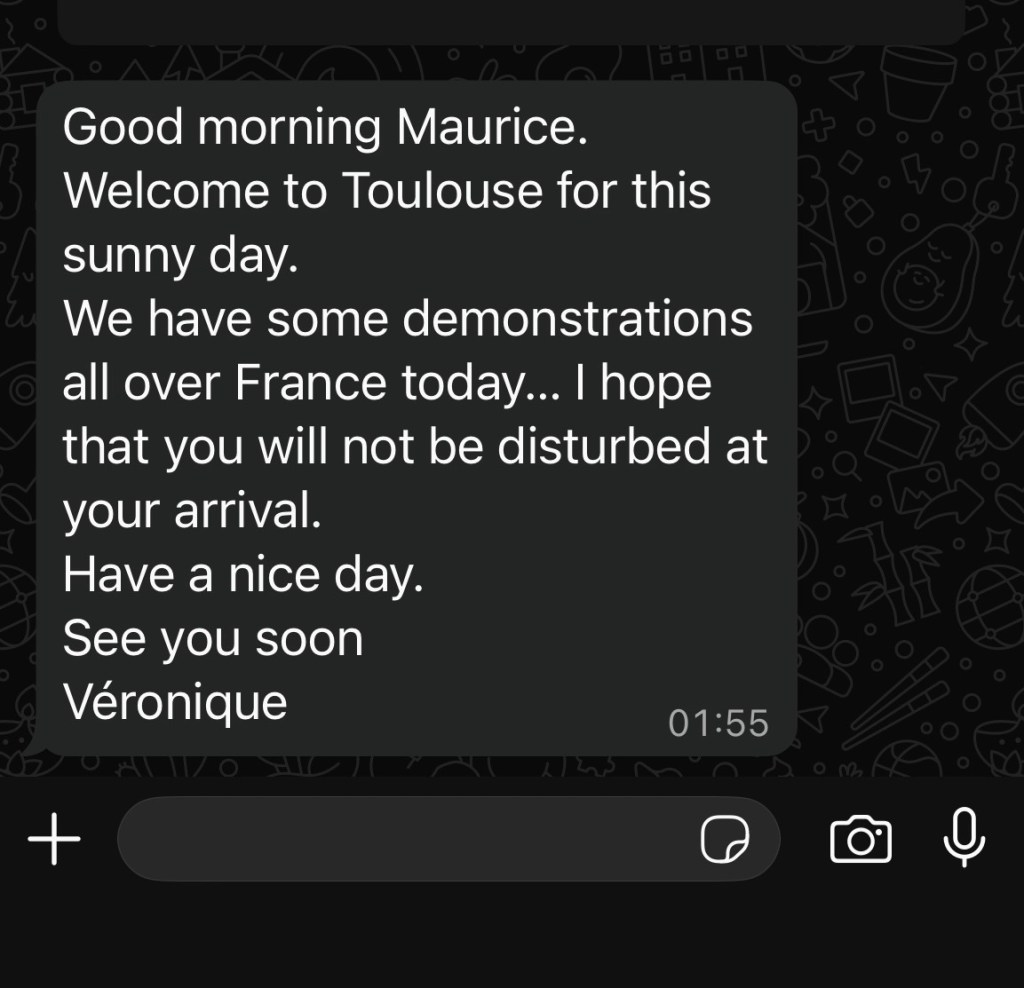 After landing in Paris, I noticed a text from Véronique, the woman who will be our guide on the tour of Gascony: