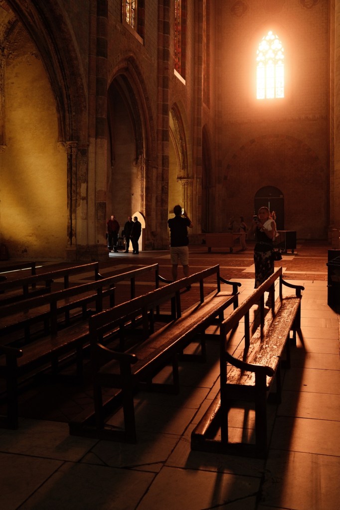 After resting at a café, we ambled back to the hotel, stopping along the way at Bénédicte’s favorite church, the Church of the Jacobins, a well-preserved example of early French Gothic architecture. Built and expanded between 1230 and 1341, the church is divided down the middle by a row of tall columns, creating a double nave where the friars were separated from the congregation by screens between the central pillars.