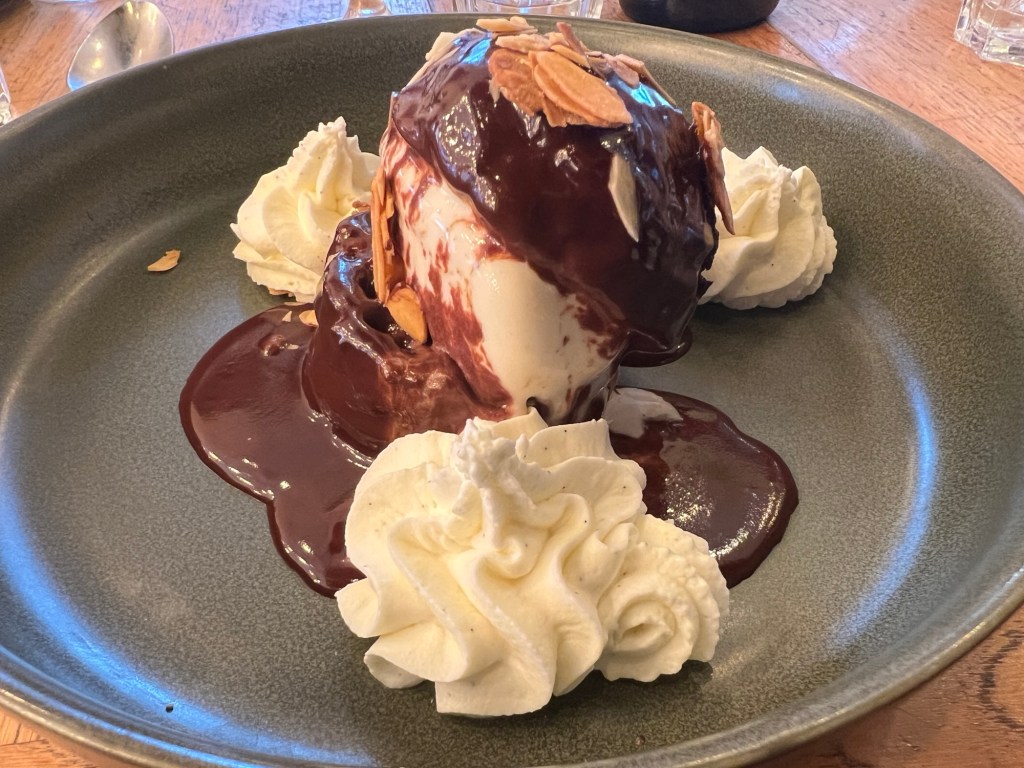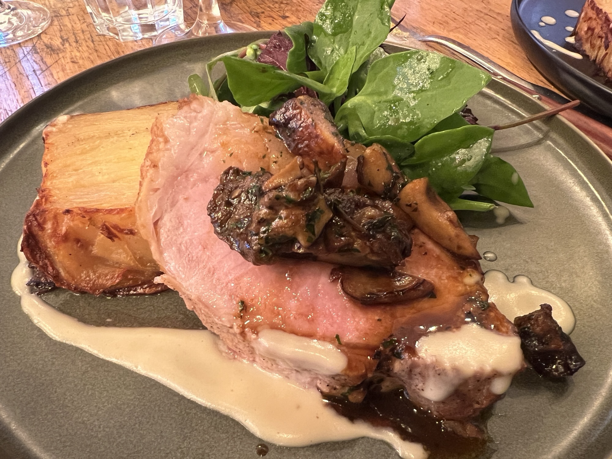 Lunch at Le J’Go was the first of what would be many delicious meals on this tour: A tomato tartare, pork with a cèpe & garlic cream sauce, and pomme Anna, a cake of very thinly-sliced potatoes cooked in a mold. (See the header photo for this entry.) Profiterole for dessert, followed by a 40-year-old Armagnac digestif.