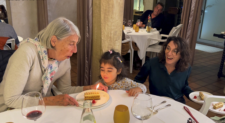 For dessert: Speculoos cake with vanilla cream. It was Pat’s birthday, and I had arranged with Véronique to have the restaurant surprise her. The restaurant’s owners, a Mexican/French couple, had a charming 3-year old daughter who kept us entertained during the meal by showing off her artwork. She serve Pat’s cake. It was perfect.