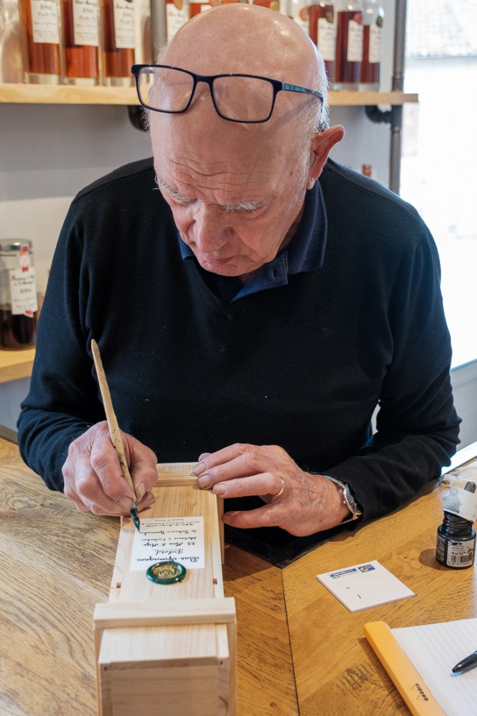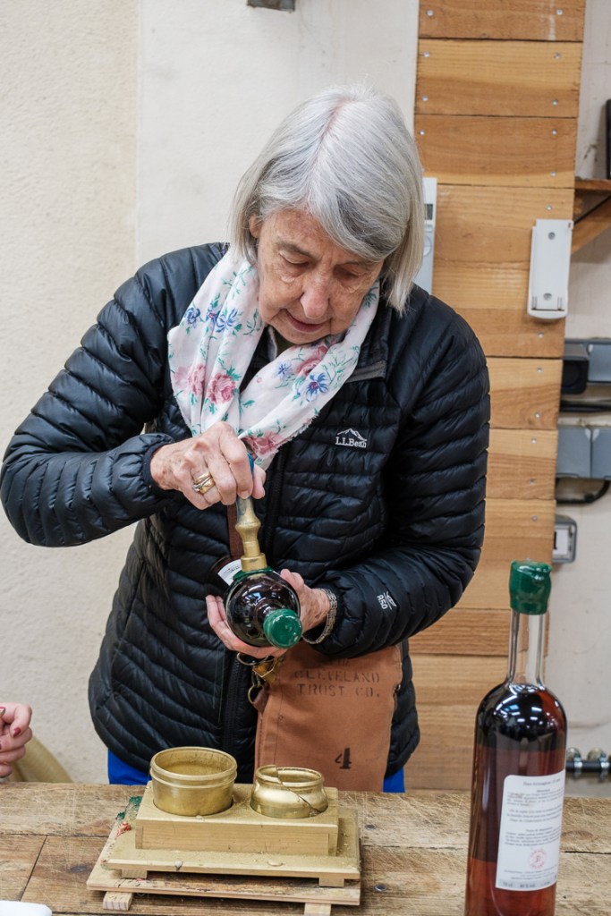 In the bottling plant, we were in for a little treat. The last step in the process is dipping the neck of the bottle in wax, to seal it, and dropping a spoonful of wax just above the label, where the Armagnac Delord stamp is placed. We were each allowed to execute those finishing steps. Our bottles were labeled with our names; a gift to us!