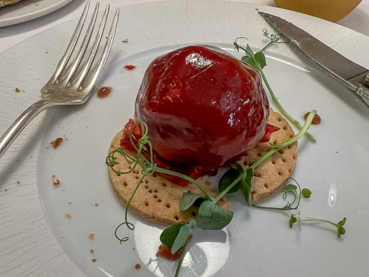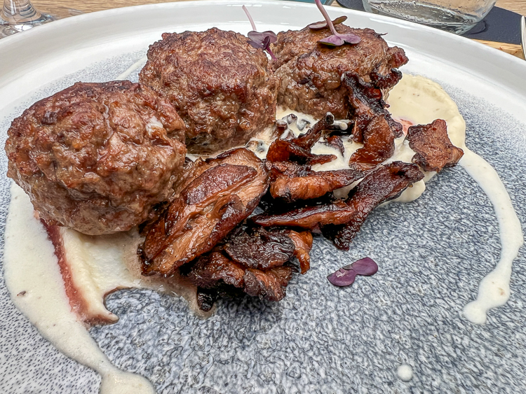 After our liquid breakfast, it was time for lunch, also in Lannepax, at La Falène Bleue. Another excellent meal, beginning with amuse-bouches: a fish fritter, chèvre mini quiches, fried Compté, cucumber gazpacho on a bed of ricotta. The main course was beef meatball with shiitake mushroom and celery root sauce, accompanied by a raw beet salad with beet fritter.