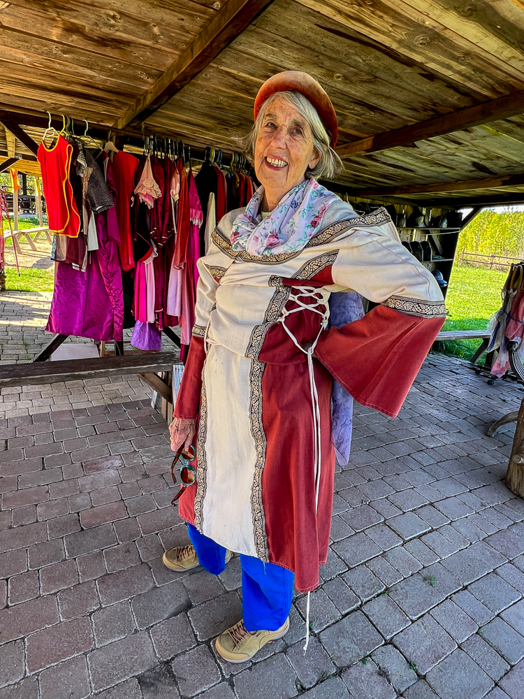 After we left the shop of Claudine Labene, we strolled through the small town, before stumbling upon something that wasn’t on our schedule. At the Medieval Siege Camp, we learned about weapons of siege warfare and, after we failed to catapult Pat over the fortified walls of the city (thanks to Véronique Banzet for the video), we tried our hand with various weapons of the 15th and 14th centuries — swords, bows and arrows, etc. Pat looked very formidable with her shield, helmet, and poleaxe.